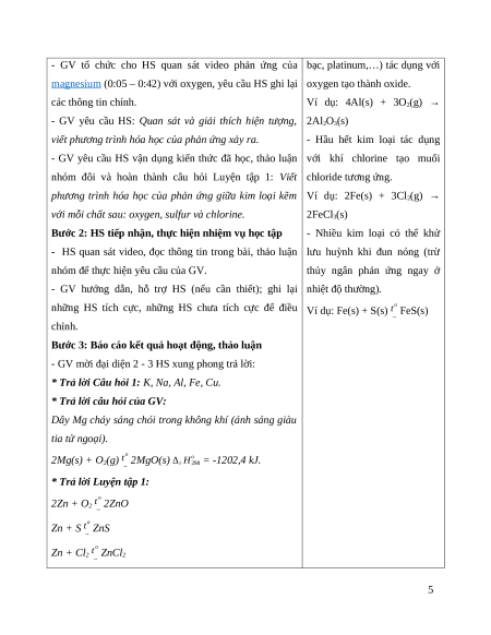 - Trình bày được phản ứng của kim loại với phi kim (chlorine, oxygen, sulfur) và