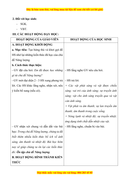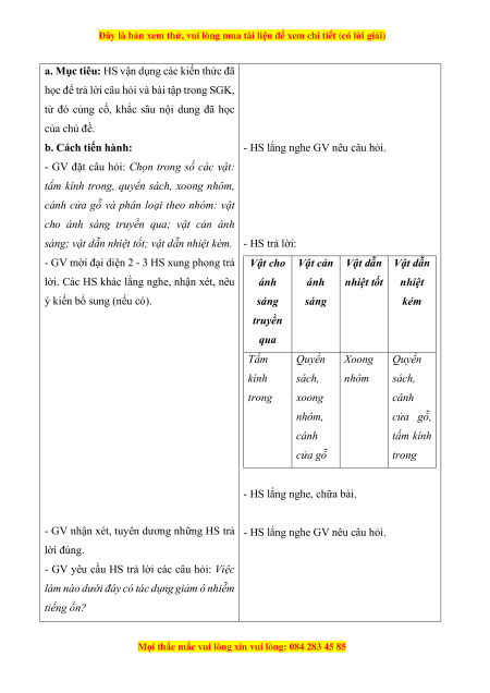 - Vận dụng được kiến thức về ánh sáng, âm thanh và nhiệt vào một số tình huống