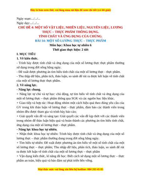 - Đề xuất được phương án tìm hiểu về một số tính chất lương thực - thực phẩm thông dụng.