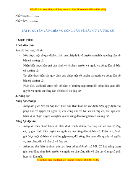 BÀI 14. QUYỀN VÀ NGHĨA VỤ CÔNG DÂN VỀ BẦU CỬ VÀ ỨNG CỬ I. MỤC TIÊU 1. Về kiến thức Sau bài học này, HS sẽ: