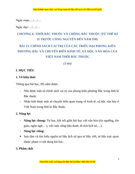 VIỆT NAM THỜI BẮC THUỘC (3 tiết) I. MỤC TIÊU 1. Về kiến thức