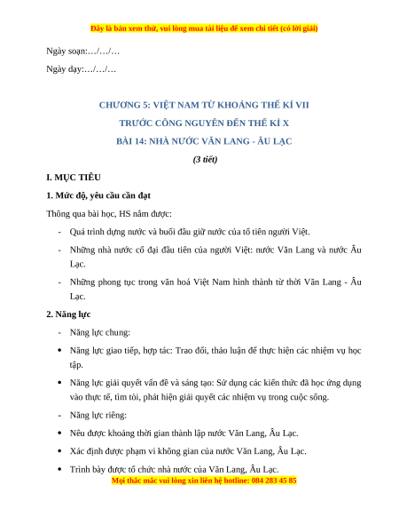 BÀI 14: NHÀ NƯỚC VĂN LANG - ÂU LẠC (3 tiết) I. MỤC TIÊU