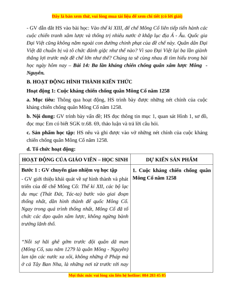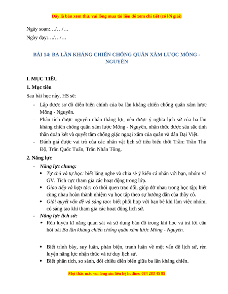 BÀI 14: BA LẦN KHÁNG CHIẾN CHỐNG QUÂN XÂM LƯỢC MÔNG - NGUYÊN I. MỤC TIÊU 1. Mục tiêu