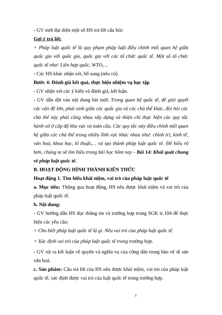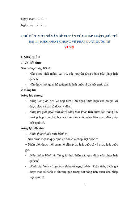 BÀI 14: KHÁI QUÁT CHUNG VỀ PHÁP LUẬT QUỐC TẾ (3 tiết) I. MỤC TIÊU 1. Về kiến thức