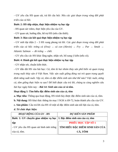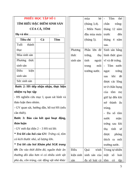 c. Sản phẩm: Câu trả lời của HS về một số đặc điểm sinh sản nổi bật của cá, tôm.