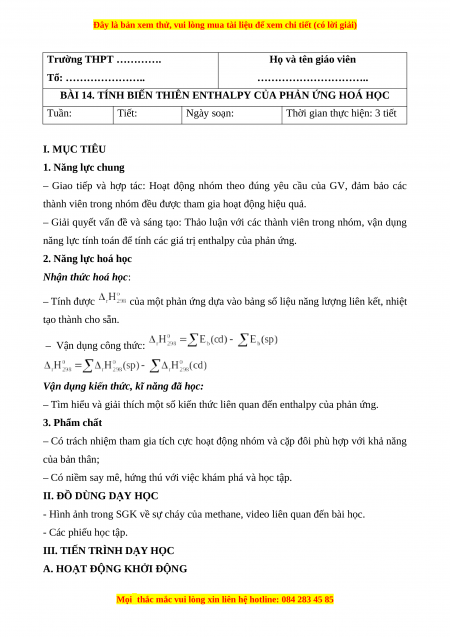 BÀI 14. TÍNH BIẾN THIÊN ENTHALPY CỦA PHẢN ỨNG HOÁ HỌC Tuần: Tiết: Ngày soạn: