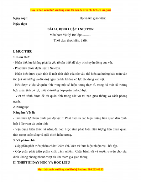 Giáo án Bài 14 Vật lí 10 Kết nối tri thức (2024): Định luận 1 Newton