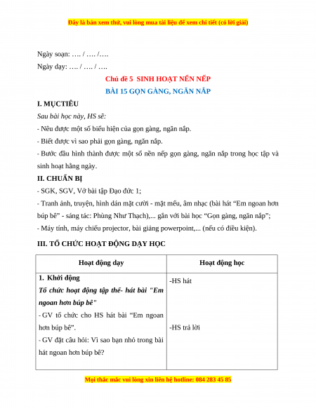 - Bước đầu hình thành được một số nền nếp gọn gàng, ngăn nắp trong học tập và sinh hoạt hằng ngày. II. CHUẨN BỊ