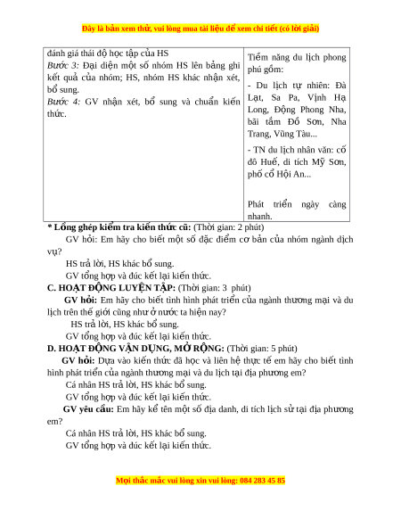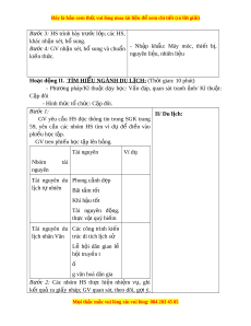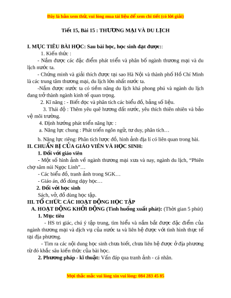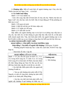 ị í có liên quan trong bài. II. CHUẨN BỊ C A Ủ GIÁO VIÊN VÀ H C Ọ SINH: 1. Đ i ố v i ớ giáo viên - M t ộ số hình nh ả về ngành thư ng ơ m i ạ x a ư và nay, ngành du l ch, ị “Phiên chợ sâm núi Ng c ọ Linh”… - Các bi u đ ể ồ, tranh nh t ả rong SGK… - Giáo án, đồ dùng d y ạ h c… ọ 2. Đ i ố v i ớ h c s ọ inh Sách, v , đ ở ồ dùng h c t ọ p. ậ III. T C Ô H C Ư CÁC HO T Ạ Đ N Ộ G H C Ọ T P Â A. HOẠT Đ N Ộ G KH I Ở Đ N Ộ G (Tình hu ng xu ố t ấ phát): (Th i ờ gian 5 phút) 1. Mục tiêu - HS tri giác, chú ý t p ậ trung, tìm hi u ể và n m ắ b t ắ đư c ợ đ c ặ đi m ể c a ủ ngành thư ng ơ m i ạ và d ch ị v ụ c a ủ nư c ớ ta và liên h ệ đư c ợ v i ớ tình hình th c ự tế t i ạ địa phư ng. ơ - Tìm ra các n i ộ dung h c ọ sinh ch a ư bi t ế , ch a ư liên h ệ đư c ợ ở đ a ị phư ng ơ t đó kh ừ ắc sâu ki n t ế h c c ứ a ủ bài h c. ọ 2. Phư ng pháp - ơ kĩ thu t