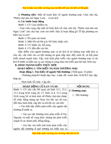 Đây là bản xem th , vu ử i lòng mua tài li u ệ đ xe ể m chi ti t (c ế ó l i ờ gi i ả ) 3. Phư ng ơ ti n ệ : M t ộ số tranh nh ả về ngành thư ng ơ m i ạ : Ch , ợ siêu th ,ị “Phiên chợ sâm núi Ng c ọ Linh… và du l ch ị 4. Các bư c ho ớ t ạ đ ng ộ Bư c ớ 1: GV Giao nhi m ệ vụ - Giáo viên cung c p ấ m t ộ số hình nh ả về ch ,