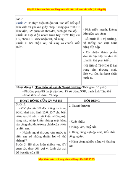 ệ GV quan sát, theo dõi, đánh giá thái đ … ộ - Phát tri n ể m nh, ạ không Bư c ớ 3: Đ i ạ di n ệ nhóm trình bày trư c ớ l p; ớ các đ u gi ề a các ữ vùng HS, nhóm HS khác nh n ậ xét, b s ổ ung. - Cả nư c ớ là 1 thị trư ng, ờ Bư c ớ 4: GV nh n ậ xét, bổ sung và chu n ẩ ki n ế hệ thống các chợ ho t ạ th c. ứ đ ng t ộ ấp n p ậ - Có nhi u ề thành ph n ầ kinh tế đ c ặ bi t ệ là kinh tế t nhân khá phát ư tri n. ể - Hà N i ộ và TP HCM là hai trung tâm thư ng ơ m i ạ , dịch vụ l n, ớ đa d ng ạ nh t ấ nư c t ớ a. Hoạt đ ng 2. ộ Tìm hi u v ể ngàn ề h Ngo i ạ thư ng ơ (Th i ờ gian: 10 phút) - Phư ng pháp/ ơ Kĩ thu t ậ d y ạ học: PP s d ử ng ụ SGK, tranh nh/ ả T p t ậ hể - Hình th c t ứ ổ ch c ứ : C l ả p ớ HOẠT Đ N Ộ G C A Ủ GV VÀ HS N I Ộ DUNG Bư c 1: ớ 2. Ngo i ạ thư ng ơ - GV yêu c u ầ HS đ c ọ thông tin trong