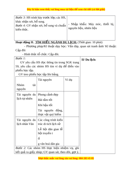 ạ học: Vấn đáp, quan sát tranh nh/ ả Kĩ thu t ậ : C p đôi ặ - Hình th c t ứ ổ ch c ứ : C p đôi ặ . Bư c 1: ớ II/ Du l ch ị : GV yêu c u ầ HS đ c ọ thông tin trong SGK trang 59, yêu c u