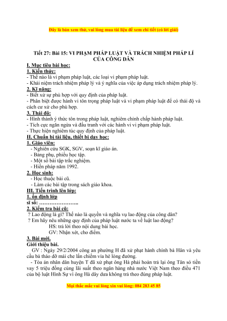 Tiết 27: Bài 15: VI PHẠM PHÁP LUẬT VÀ TRÁCH NHIỆM PHÁP LÍ CỦA CÔNG DÂN I. Mục tiêu bài học: 1. Kiến thức: