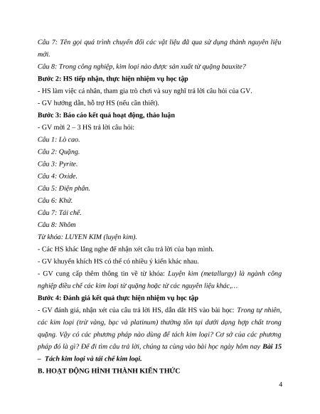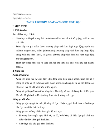 Giáo án Bài 15 Hóa học 12 Cánh Diều: Tách kim loại và tái chế kim loại