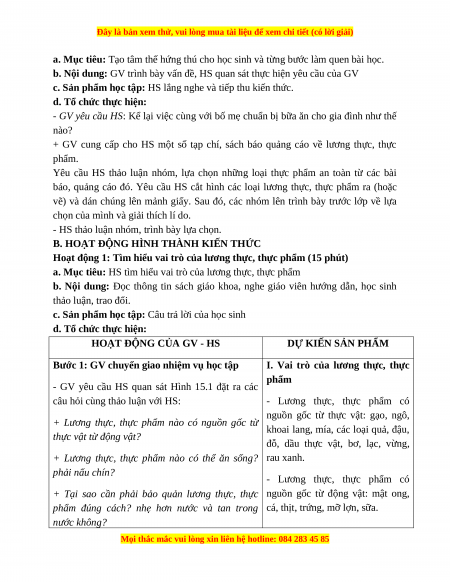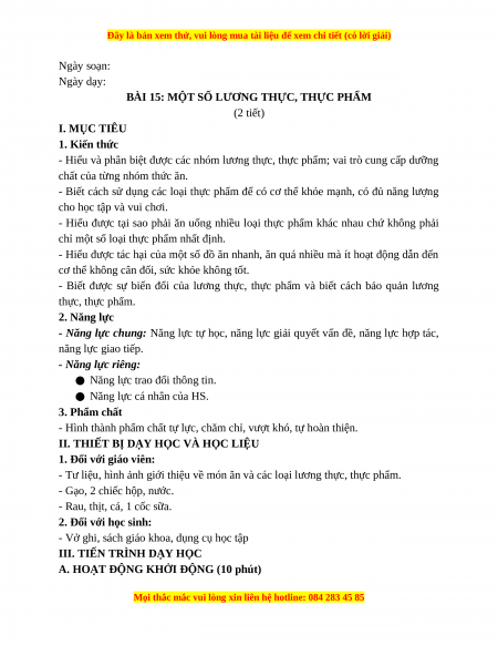 BÀI 15: MỘT SỐ LƯƠNG THỰC, THỰC PHẨM (2 tiết) I. MỤC TIÊU 1. Kiến thức