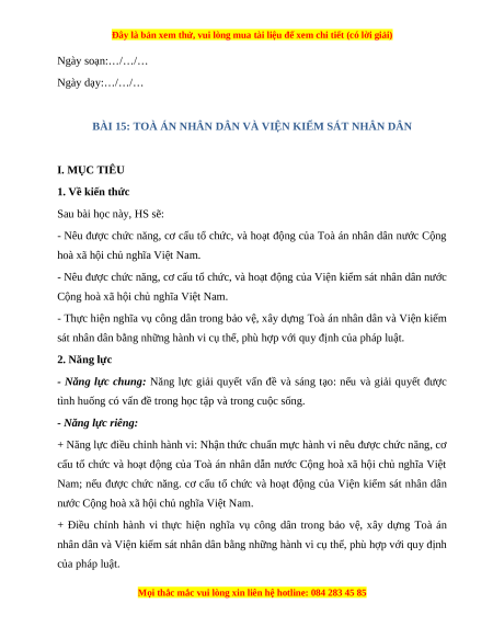 BÀI 15: TOÀ ÁN NHÂN DÂN VÀ VIỆN KIỂM SÁT NHÂN DÂN I. MỤC TIÊU 1. Về kiến thức Sau bài học này, HS sẽ:
