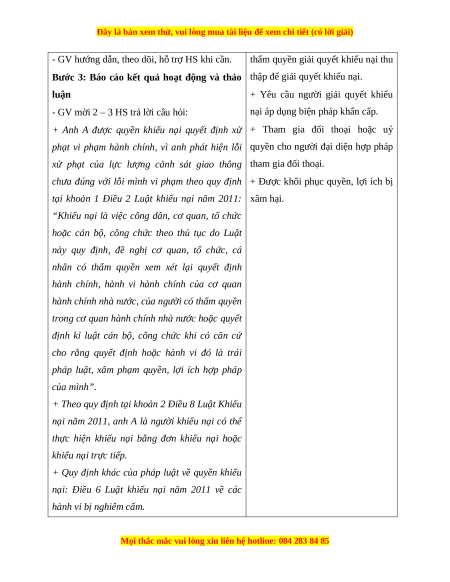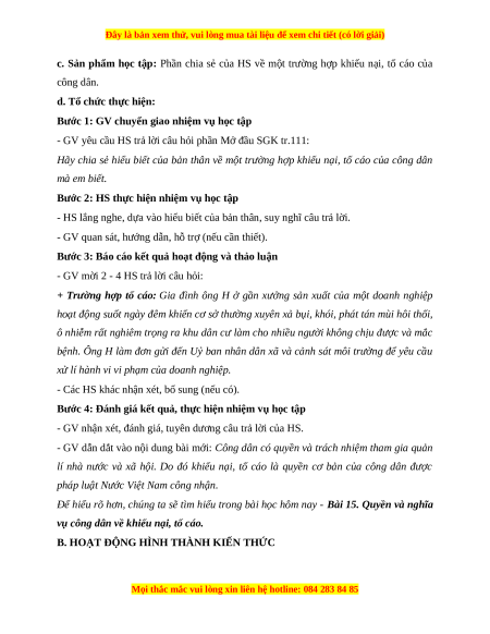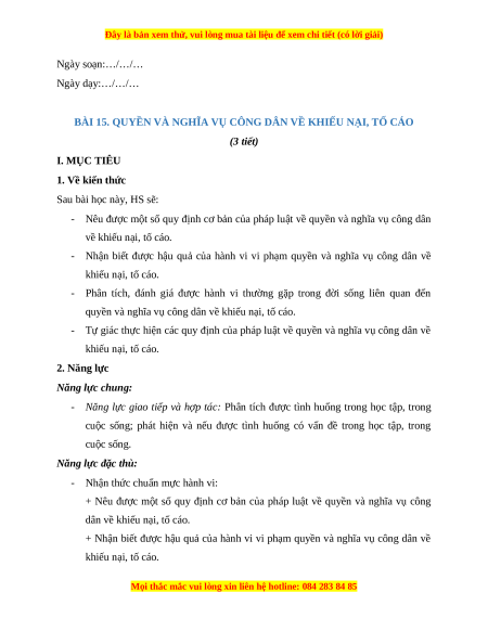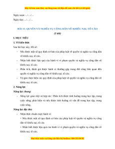BÀI 15. QUYỀN VÀ NGHĨA VỤ CÔNG DÂN VỀ KHIẾU NẠI, TỐ CÁO (3 tiết) I. MỤC TIÊU 1. Về kiến thức Sau bài học này, HS sẽ: