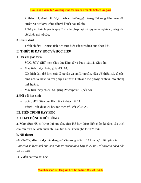 + Tự giác thực hiện các quy định của pháp luật về quyền và nghĩa vụ công dân về khiếu nại, tố cáo. 3. Phẩm chất: