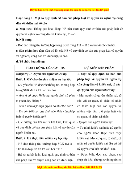 Giáo án Bài 15 KTPL 11 Chân trời sáng tạo: Quyền và nghĩa vụ công dân về khiếu nại, tố cáo