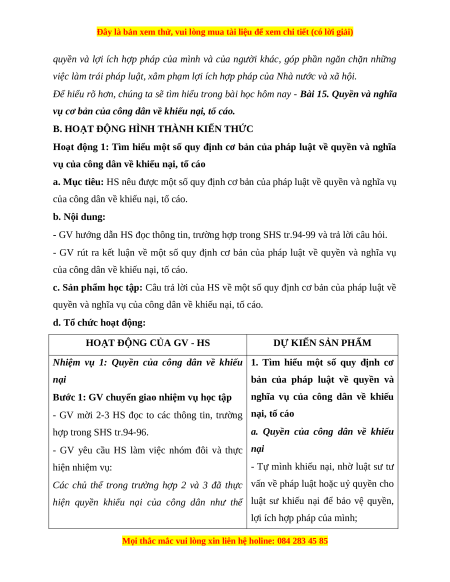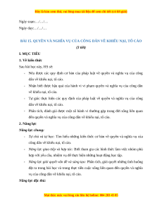 BÀI 15. QUYỀN VÀ NGHĨA VỤ CỦA CÔNG DÂN VỀ KHIẾU NẠI, TỐ CÁO (3 tiết) I. MỤC TIÊU 1. Về kiến thức Sau bài học này, HS sẽ: