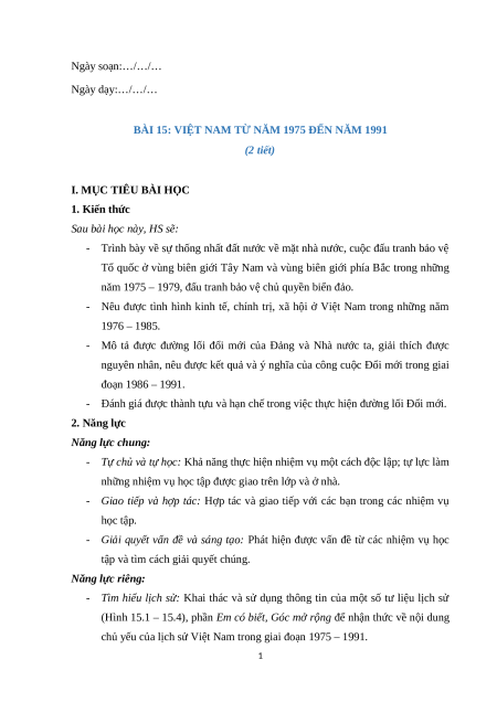 BÀI 15: VIỆT NAM TỪ NĂM 1975 ĐẾN NĂM 1991 (2 tiết)