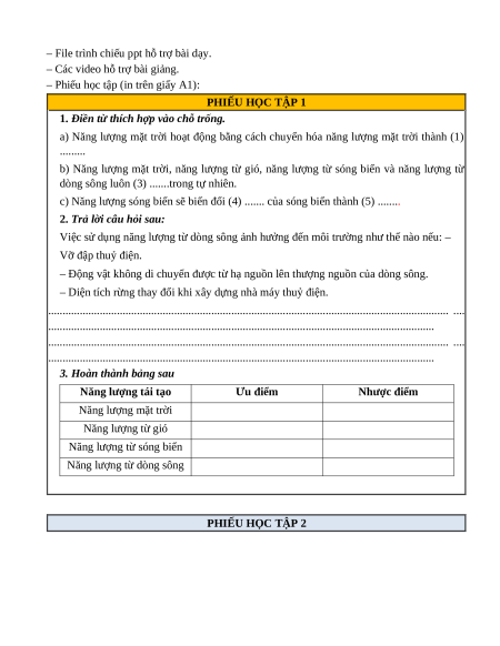 Năng lượng từ dòng sông PHIẾU HỌC TẬP 2