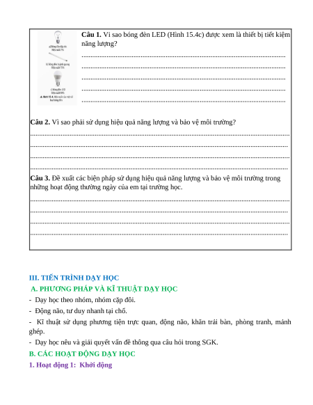 – Thảo luận để nêu được một số biện pháp sử dụng hiệu quả năng lượng và bảo vệ môi trường. 3. Về phẩm chất