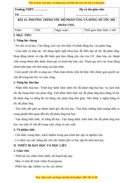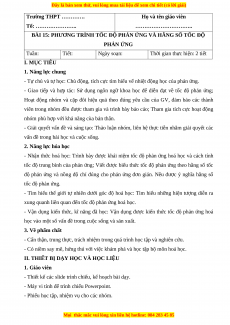 BÀI 15: PHƯƠNG TRÌNH TỐC ĐỘ PHẢN ỨNG VÀ HẰNG SỐ TỐC ĐỘ PHẢN ỨNG Tuần: Tiết: Ngày soạn: