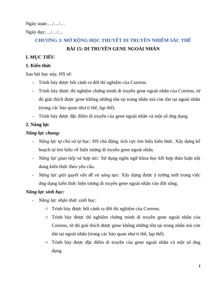 Giáo án Bài 15 Sinh học 12 Kết nối tri thức: Di truyền gene ngoài nhân