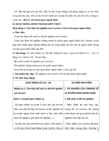 Hoạt động 1: Tìm hiểu thí nghiệm của Correns về di truyền gene ngoài nhân a. Mục tiêu: