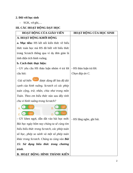 - Các phép toán số học, phép so sánh và một số phép toán khác trong Scratch. 2. Năng lực