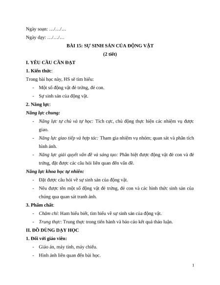 Giáo án Bài 15: Sự sinh sản của động vật Khoa học lớp 5 Chân trời sáng tạo