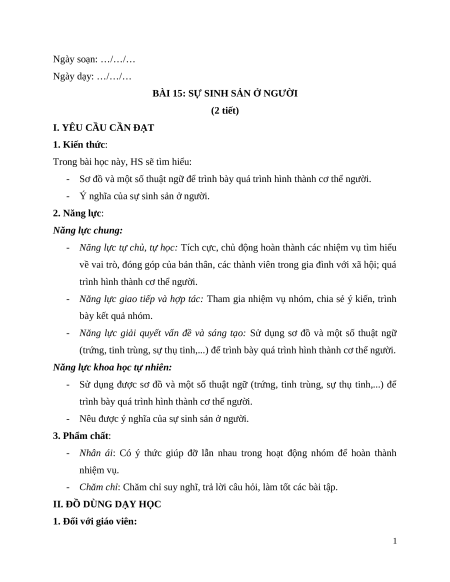 BÀI 15: SỰ SINH SẢN Ở NGƯỜI (2 tiết)