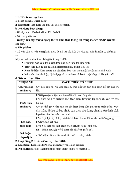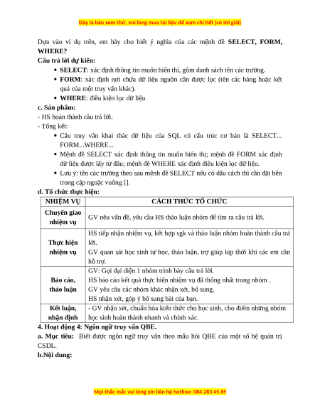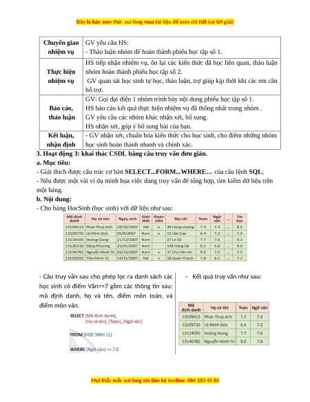 3. Hoạt động 3: khai thác CSDL bằng câu truy vấn đơn giản. a. Mục tiêu: