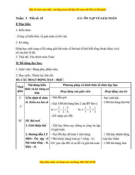 Tuần: 3 Tiết số: 15 BÀI: ÔN TẬP VỀ GIẢI TOÁN