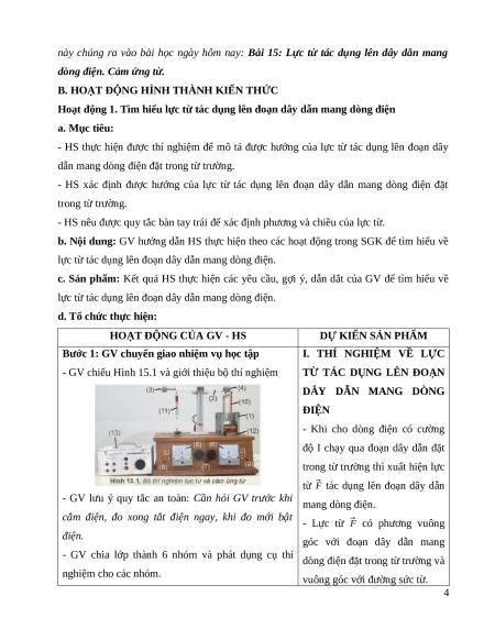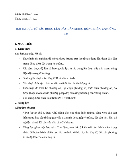 Giáo án Bài 15 Vật Lí 12 Kết nối tri thức (2025): Lực từ tác dụng lên dây dẫn mang dòng điện. Cảm ứng từ