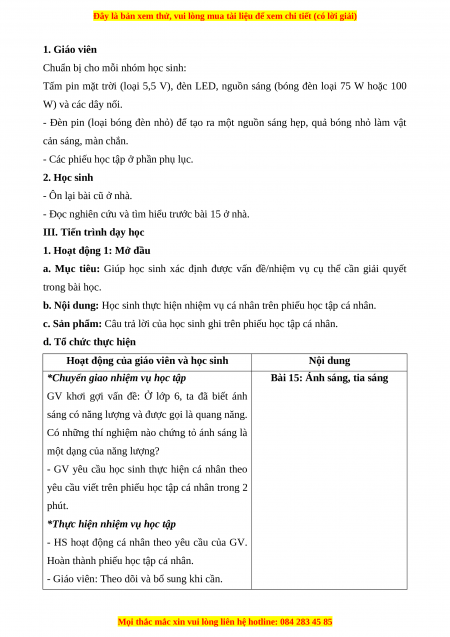 - GV hướng dẫn HS thực hiện thí nghiệm hình 15.1 - Năng lượng ánh sáng có SGK: