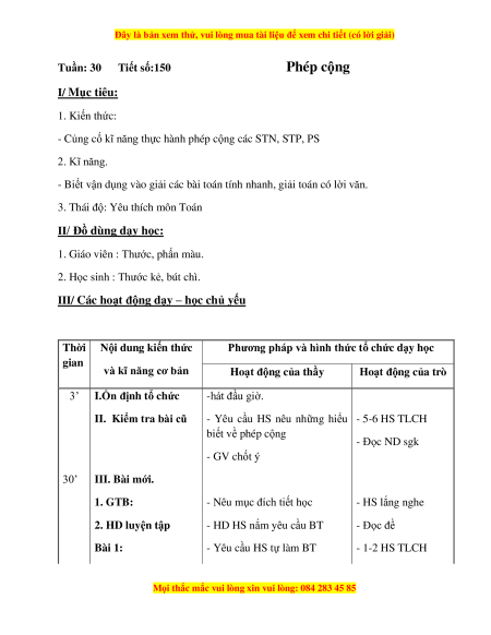 Tuần: 30 Tiết số:150 Phép cộng I/ Mục tiêu: 1. Kiến thức: