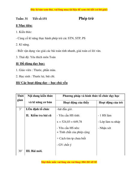 Tuần: 31 Tiết số:151 Phép trừ I/ Mục tiêu: 1. Kiến thức: