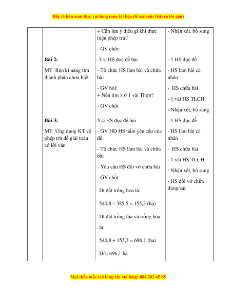 - Yêu cầu HS đổi vở chữa bài - Nhận xét, bổ sung - GV chốt - HS đổi vở chữa Dt đấ đúng/sai t trồng hoa là: 540,8 – 385,5 = 155,3 (ha)