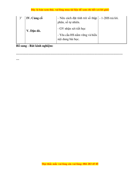 - Nêu cách đặt tính trừ số thập - 1-2HS trả lời. phân, số tự nhiên. - GV nhận xét tiết học V. Dặn dò.