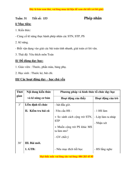 Tuần: 31 Tiết số: 153 Phép nhân I/ Mục tiêu: 1. Kiến thức: