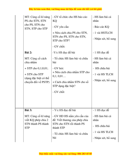 - Củng cố kĩ năng thực hiện phép chia (PS cho STN, STN cho PS, STN cho STN, STP cho STP)