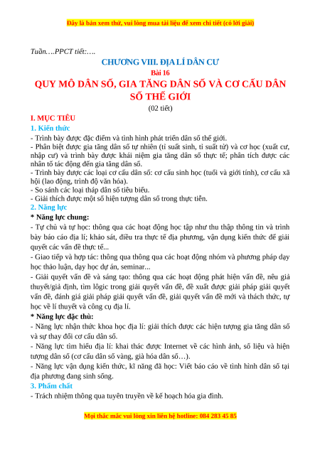 QUY MÔ DÂN SỐ, GIA TĂNG DÂN SỐ VÀ CƠ CẤU DÂN SỐ THẾ GIỚI (02 tiết) I. MỤC TIÊU 1. Kiến thức