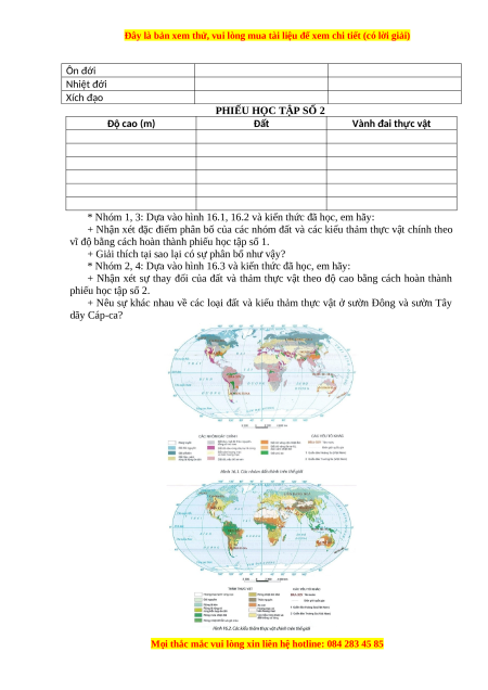 PHIẾU HỌC TẬP SỐ 2 Độ cao (m) Đất Vành đai thực vật