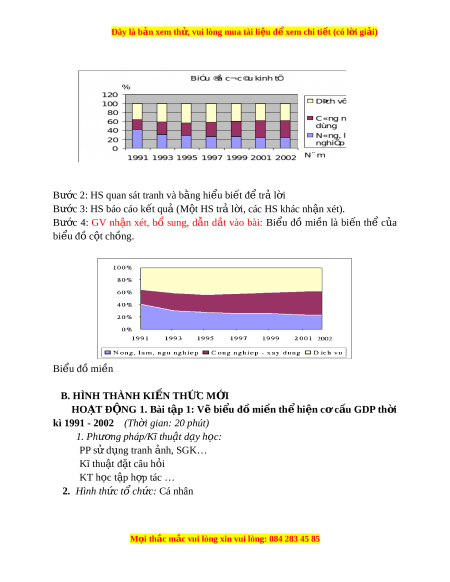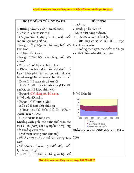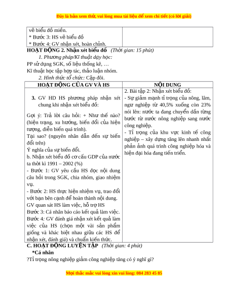 Đây là bản xem th , vu ử i lòng mua tài li u ệ đ xe ể m chi ti t ế (có l i ờ gi i ả ) vẽ bi u đ ể ồ mi n. ề * Bư c 3: ớ HS v bi ẽ u đ ể ồ * Bư c 4: ớ GV nh n xét ậ , hoàn ch nh. ỉ HOẠT Đ N Ộ G 2. Nh n xét ậ bi u đ ể ồ (Th i ờ gian: 15 phút) 1. Phư ng pháp/ ơ Kĩ thu t ậ d y h ạ ọc: PP s d ử ng ụ SGK, s l ố i u t ệ h ng kê, … ố Kĩ thu t ậ h c t ọ p h ậ p ợ tác, th o l ả u n ậ nhóm. 2. Hình th c t ứ ổ ch c ứ : C p đôi ặ . HOẠT Đ N Ộ G C A Ủ GV VÀ HS N I Ộ DUNG 2. Bài t p ậ 2: Nh n xét ậ bi u đ ể : ồ 3. GV HD HS phư ng ơ pháp nh n ậ xét - Sự gi m ả m nh ạ t ỉtr ng ọ c a ủ nông, lâm, chung khi nh n xét ậ bi u ể đồ: ngư nghiệp từ 40,5% xu ng ố còn 23% nói lên: nư c ớ ta đang chuy n ể d n ầ t ng ừ G i ợ ý: Trả l i ờ câu h i ỏ : + Như thế nào? bư c ớ từ nước nông nghi p ệ sang nư c ớ (hi n ệ tr ng, ạ xu hư ng, ớ bi n ế đ i ổ c a ủ hi n ệ công nghiệp. tư ng, ợ di n bi ễ n quá t ế rình). - Tỉ tr ng ọ c a ủ khu v c ự kinh tế công T i ạ sao? (nguyên nhân d n ẫ đ n ế sự bi n ế nghiệp – xây d ng ự tăng lên nhanh nh t ấ đổi trên) ph n ả nh ả quá trình công nghi p ệ hóa và Ý nghĩa c a ủ sự bi n đ ế ổi. hiện đ i ạ hóa đang ti n t ế ri n. ể b. Nh n ậ xét bi u ể đ ồ c c ơ u ấ GDP c a ủ nư c ớ ta th i ờ kì 1991 – 2002 (%) - Bư c ớ 1: GV yêu c u ầ HS đ c ọ n i ộ dung câu h i