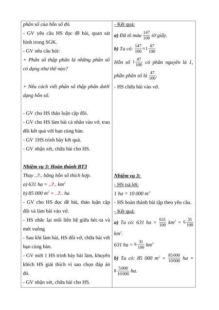 - Sau khi làm bài, HS đổi vở, chữa bài với 31 bạn cùng bàn. 631 ha = 6 km2 100
