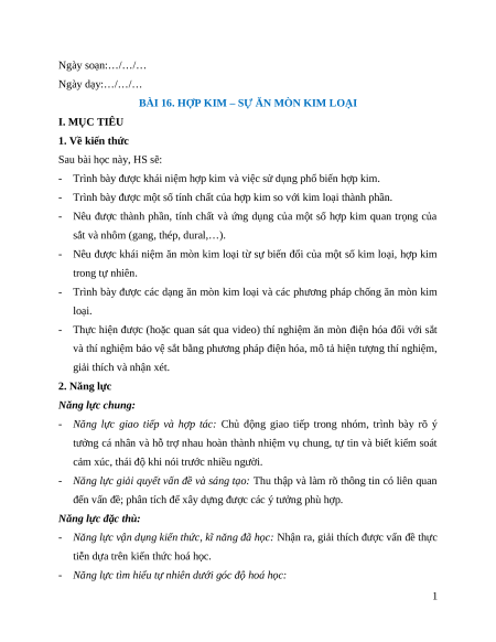 Giáo án Bài 16 Hóa học 12 Cánh Diều: Hợp kim – Sự ăn mòn kim loại
