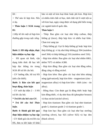 c. Sản phẩm: Câu trả lời của HS về hợp kim, tính chất hợp kim, một số hợp kim quan trọng của sắt và nhôm.