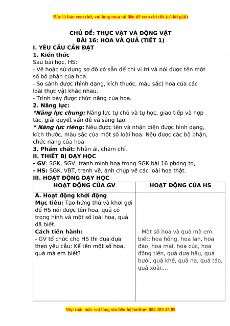 BÀI 16: HOA VÀ QUẢ (TIẾT 1) I. YÊU CẦU CẦN ĐẠT 1. Kiến thức Sau bài học, HS: